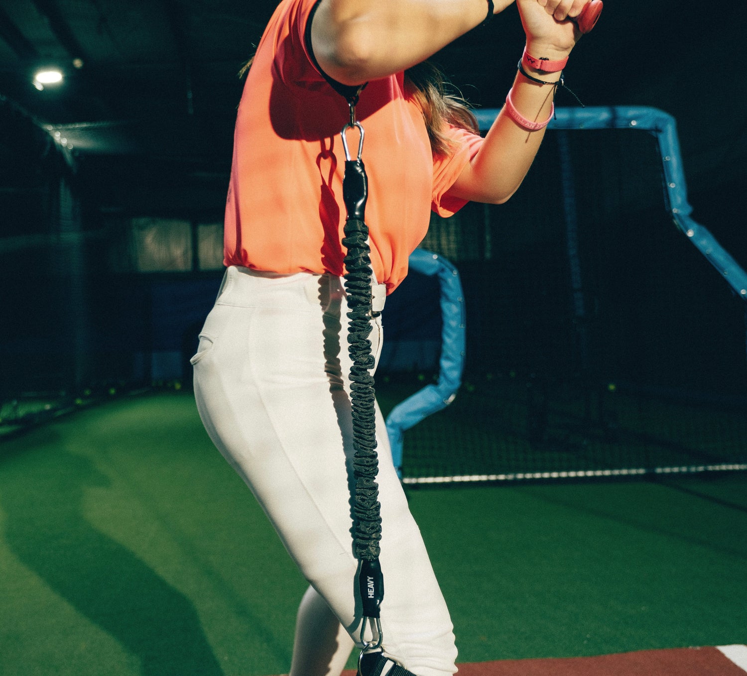 • As the hitter swings, the band provides resistance that ensures the hips and torso drive the swing, with the hands following in a connected motion.