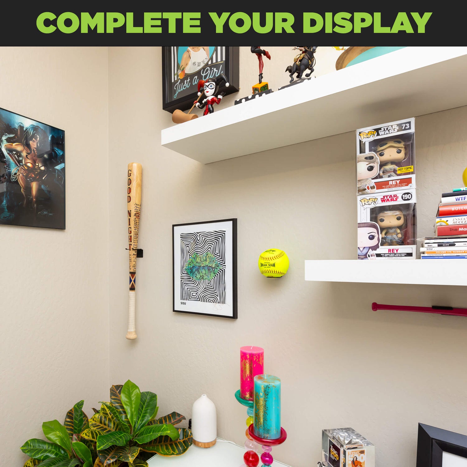 The HIDEit Medium Ball Mount is designed with softballs in mind. This steel mount displays your favorite softball + the minimal design gives it a free-floating look. With this softball wall mount, display your game ball, team-signed ball, or first home run ball. This medium ball wall mount is quick and easy to install, perfect for creating your dream softball display. Plus, it holds 3-4.5" balls— polo, bocce + more!