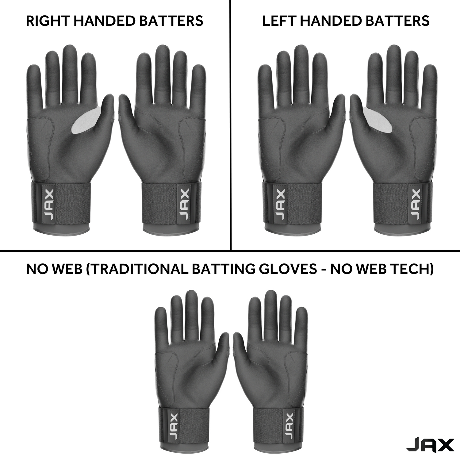 Answer: We now offer a Jax Batting Glove variant that does not include our web protection feature. This means that if you prefer not to use our web feature, you can choose this variant and enjoy the gloves just like any other standard batting glove.